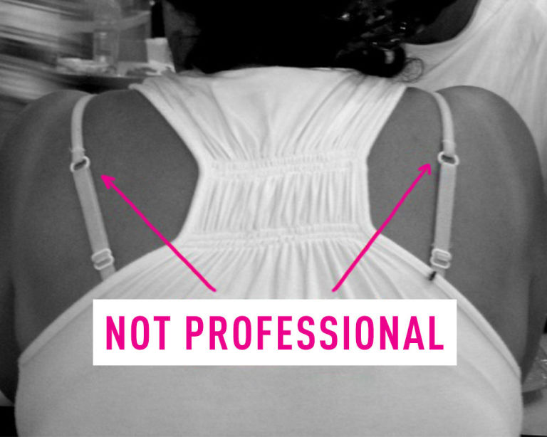 Even something as seemingly innocent as a camisole peeking out from an open blouse can read as inappropriate in an office environment, especially if it has little spaghetti straps or lace detailing that make it look especially like lingerie.